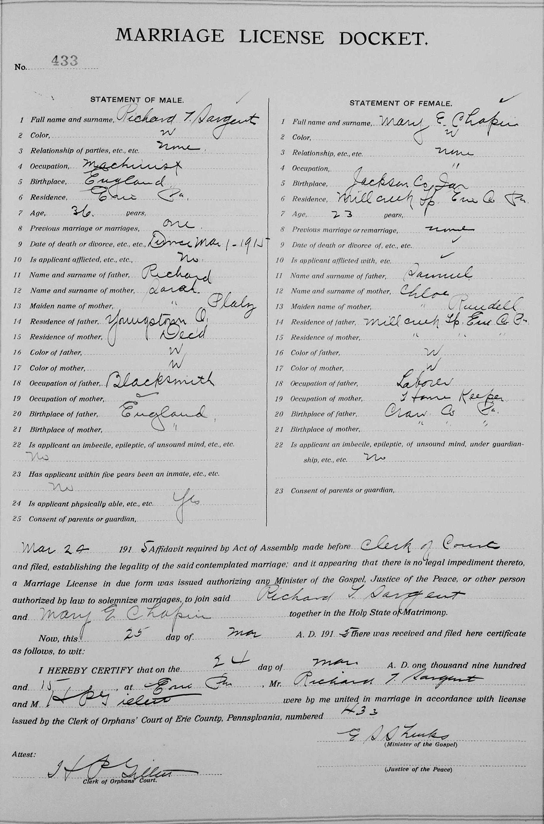 - Married Maude Little 25 Decemeber 1909 Youngstown, OH.