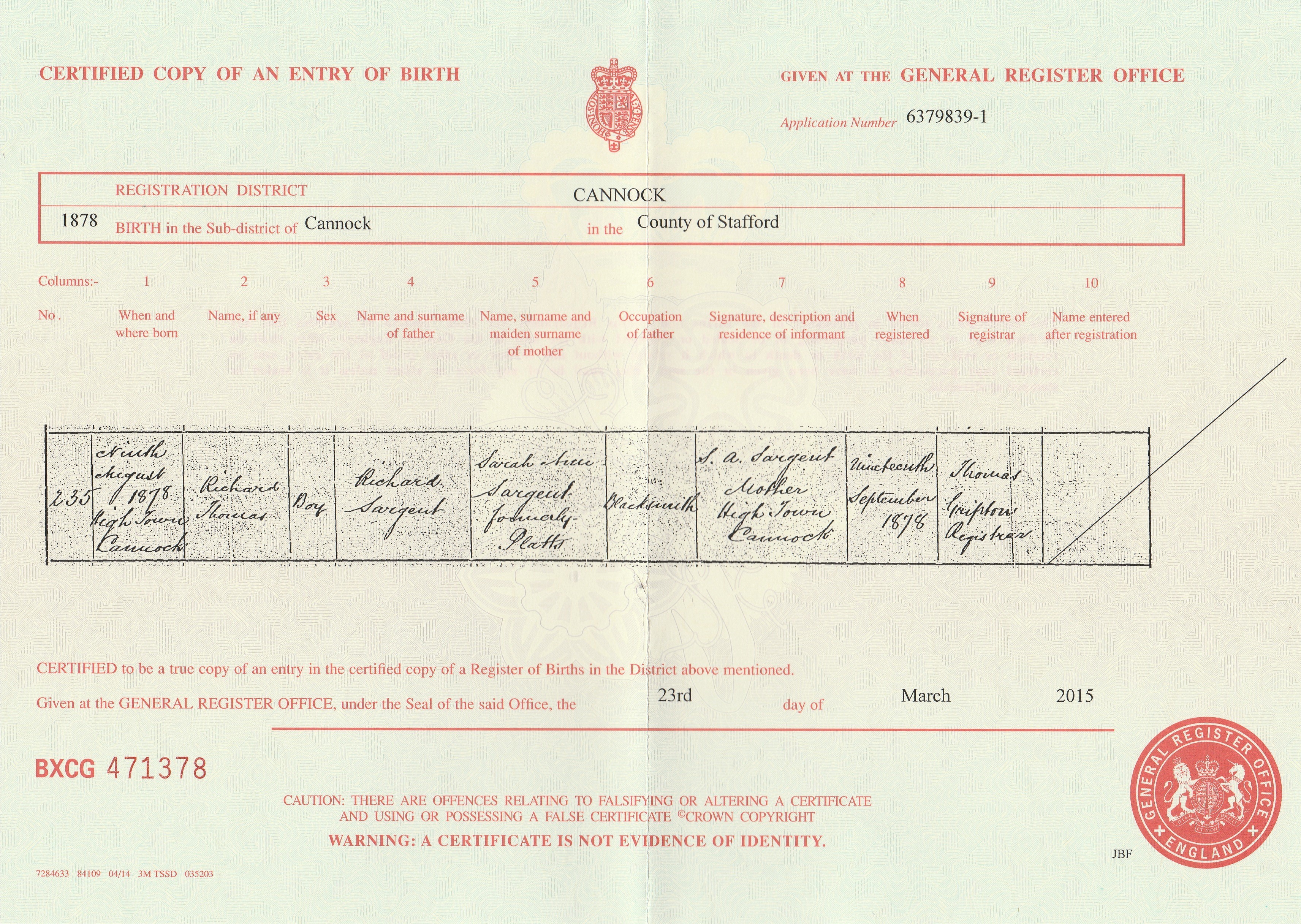 - 25 December 1877 - Married Richard Sargent in Cannock, Staffordshire, England.