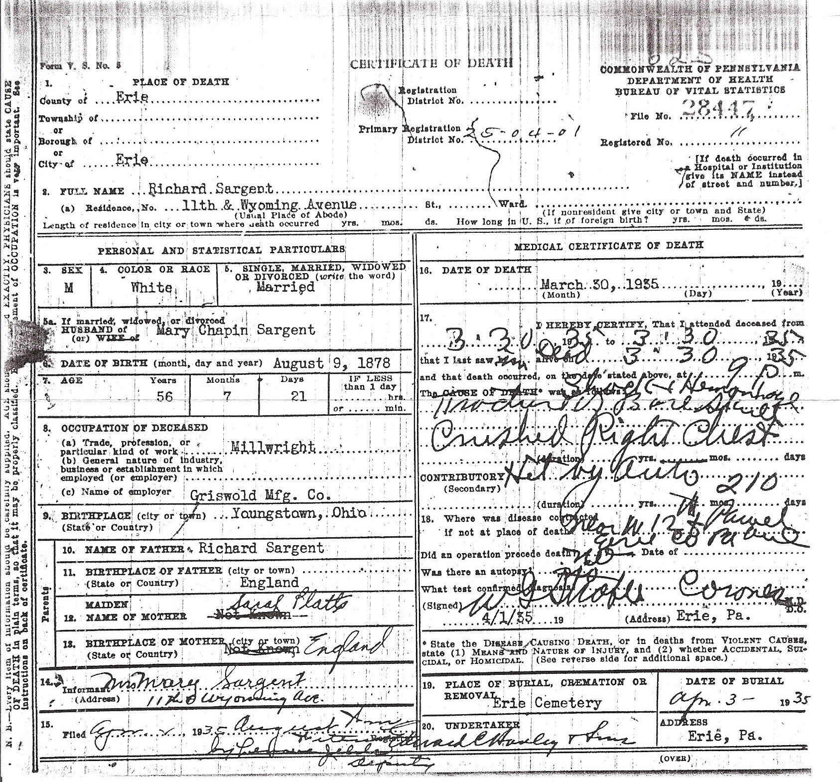 - 18 December 1922???? - Died Erie, PA. Buried Erie Cemetery.